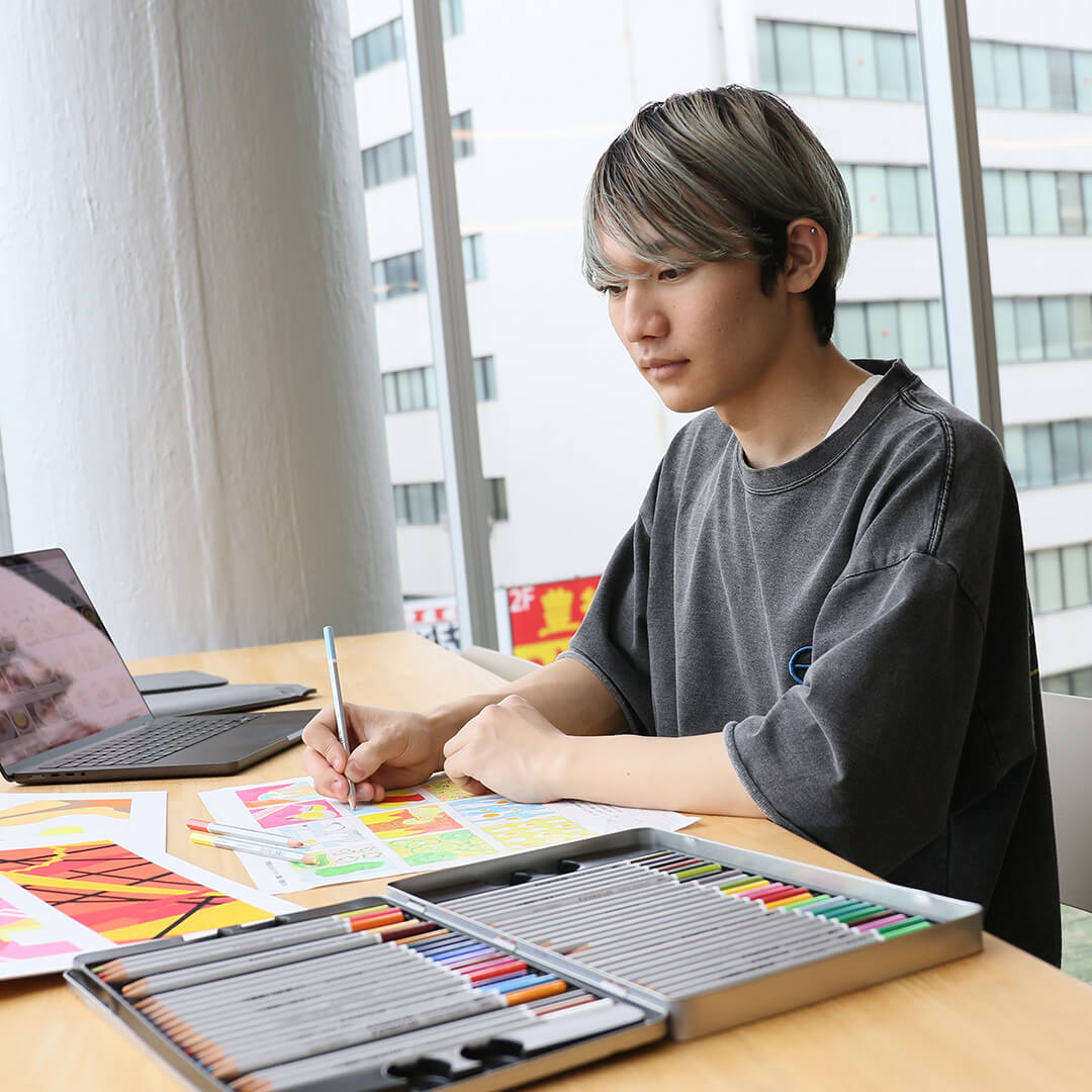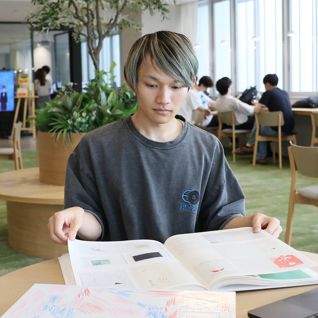 A.商品パッケージやポスター、Webデザインなどを幅広く学びたいと思い、入学を決めました。デザインソフトの技術を学べる学校、商業デザインを学べる学校、さらに紙もWebも両方学べる学校を探していたので、シズデを選びました。